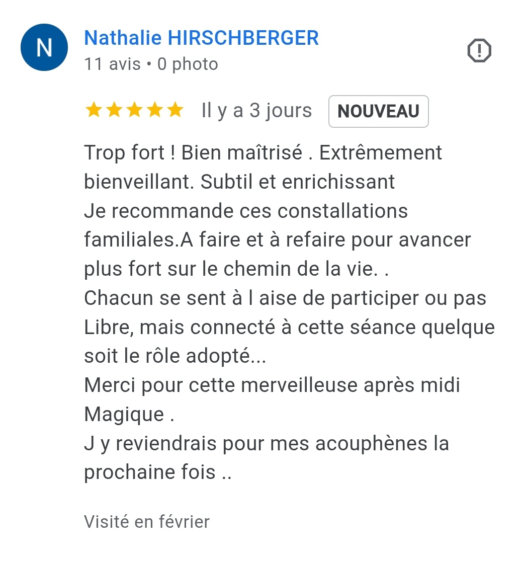 Nous commençons par une présentation de la constellation familiale, des règles de bienveillance du groupe, puis par un exercice de lâcher-prise afin d’entrer en douceur dans l’expérience.